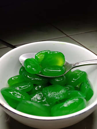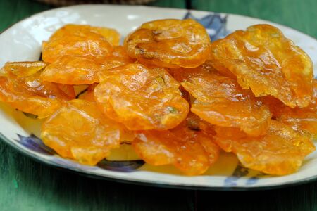 Bael fruit or Aegle marmelos preserved by sweet syrup on container for sale at the asian market or street food.
