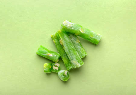 Still life with pieces of Turkish delight, green tea and walnut on a old wood background