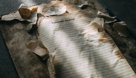 An old, damaged journal with torn pages and a lined interior sits on a dark background.