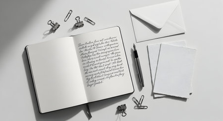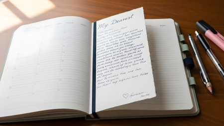 An open diary or journal lies on a wooden desk. One page is flipped open to reveal a handwritten letter in cursive script. Several pens and a pencil are placed beside the diary, suggesting recent use. Sunlight casts shadows across the pages, creating a warm and intimate atmosphere.