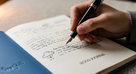 A close-up of a person's hand writing with a fountain pen in a 'MOOD JOURNAL'. The journal is open to a page with handwritten text and a small drawing of a sad, rainy cloud. This image represents journaling, mental health, and self-reflection.