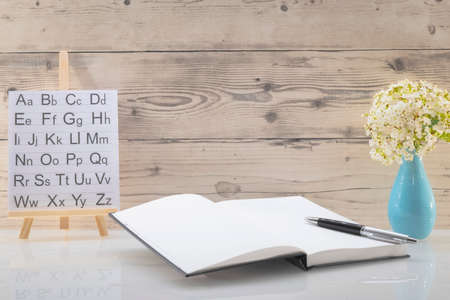 Open book on a desk on wooden background. Scandinavian atmosphere.
