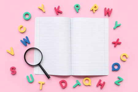 Composition with blank open notebook, magnifier and colorful letters on pink background
