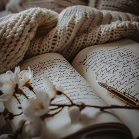 A close-up, overhead view of hands writing the words 'Dear Diary.' in an open journal or notebook with a pen, illuminated by the warm, soft light of a table lamp. A small, delicate dried flower is placed between the pages, adding a touch of nostalgia and sentimentality. The scene evokes a sense of personal reflection, introspection, memory-keeping, and quiet moments of self-expression in a cozy, intimate setting.