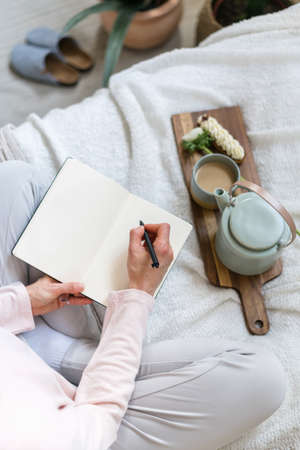 Woman sitting at the table, writing in the notebook and drinking coffee in nice light home interior. Working at home. Freelancer. writing down ideas. indoors. Top view.