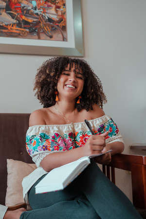 woman smiling reading and writting a book