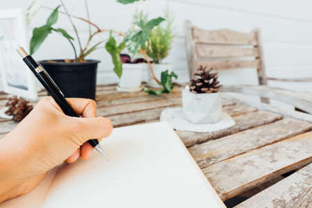 Asian young businessman or student holding a pencil writing letter on paper at home with flower pot on the wooden table in a morning