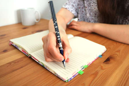 hand of a young student girl writing the class homework in an empty notebook with a pen on a wooden table and a cup of coffee - background for a blog