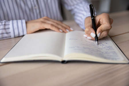 Crop close up young woman writing in notebook, holding pen, student taking notes, preparing to exam, successful businesswoman entrepreneur planning workday in organizer, meetings, managing time