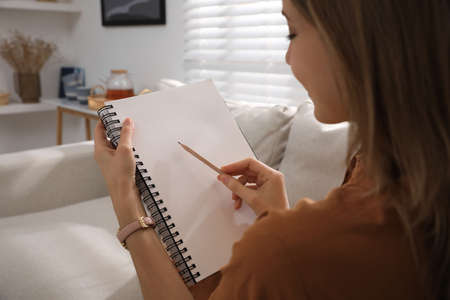 Closeup shot of hand blonde student lady with copybook sitting in sofa couch at modern living room interior. Female client have shrink appointment in psychological help office. Copy space. Cool offer
