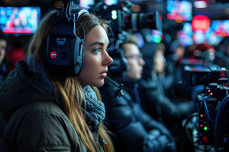 In a bustling live news studio anchors are focused on their tasks surrounded by cameras and monitors. The atmosphere is charged with energy as they prepare for broadcast.