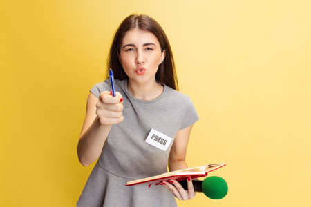 Emotional young girl, female reporter holding reporter microphone isolated on yellow studio background. Concept of social media, press, news, information