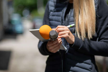 Journalist at press conference or media event, holding microphone, writing notes. Journalism concept.