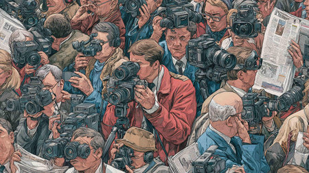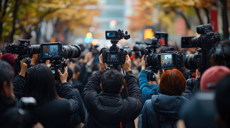 A large group of photographers stands in a city street, raising cameras high to capture the event unfolding in front of them. The warm glow of the golden hour highlights the excitement and energy of the gathering.