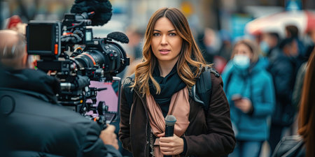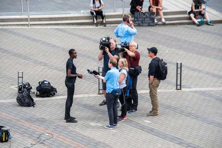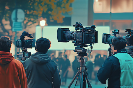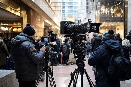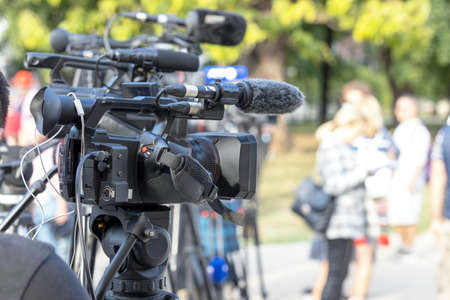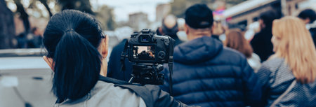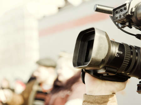 Filming street protest, television camera lens in the focus, blurred people in the background