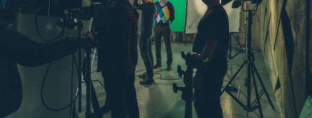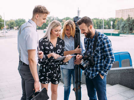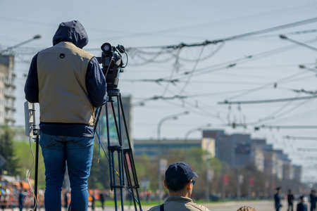 Behind the scenes of a movie. Cameraman and videographer working on the camera.