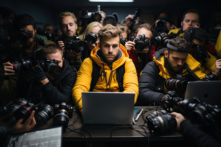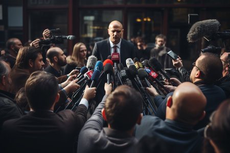 business man important press release surrounded scramble with reporters newspaper journalist photographer