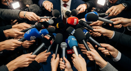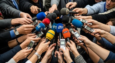 A close-up view of numerous hands holding microphones and recorders, focused on a person speaking at a press conference.