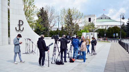 Warsaw, Poland. 7 May 2020. Candidate for the office of Polish President Szymon Holownia. View of press and media cameras working on public news coverage event for reporters and mass communication.