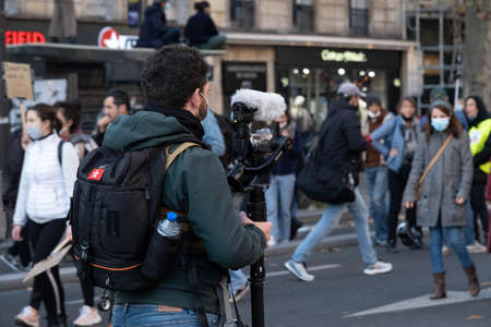 Paris, France - November 28th 2020: at the march against the global security law, a journalist heavily equipped walking
