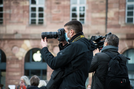 Strasbourg - France - 4 February 2021 - Portrait of french reporter photographer shooting in the street with a nikon camera