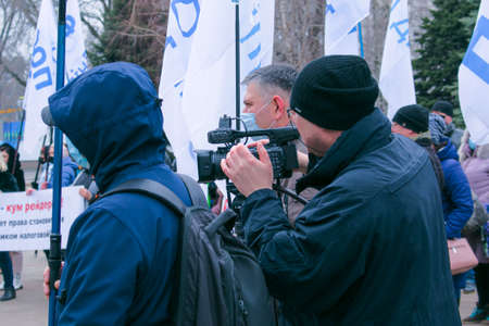 Dnepropetrovsk, Ukraine - 03.19.2021: Journalists work at a rally of entrepreneurs to protest the imposition of quarantine.