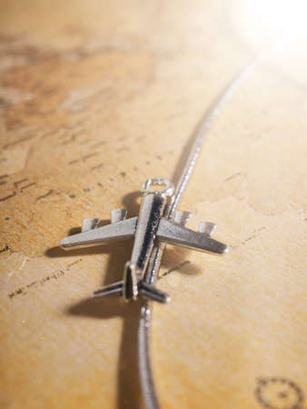 One toy metal plane on the background of an old map, the concept of travel, discovery.