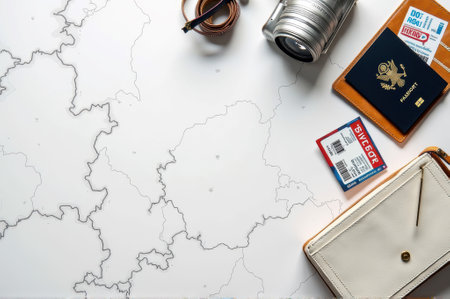 Travel essentials: map, camera, passport, tickets, wallet for adventure planning. That the image is generated using AI.