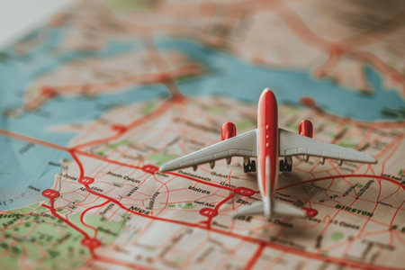 Miniature airplane standing on a road map, suggesting planning a trip, a journey or an adventure