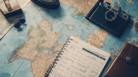 A vibrant travel scene featuring a world map, vintage camera, and stylish accessories, inspiring a sense of wanderlust and the thrill of discovering new destinations