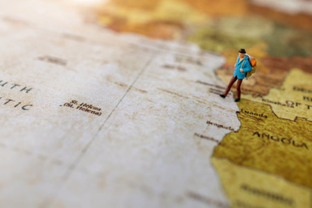 Small Toy Figurine Navigating a Colorful Paper Atlas, Exploring Geography and Adventure Maps