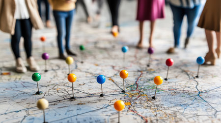 A detailed map with vibrant pinpoint markers showing specific locations in colorful and detailed accuracy