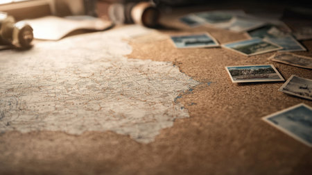 Vintage map surrounded by camera gear and passport on rustic table. That the image is generated using AI.