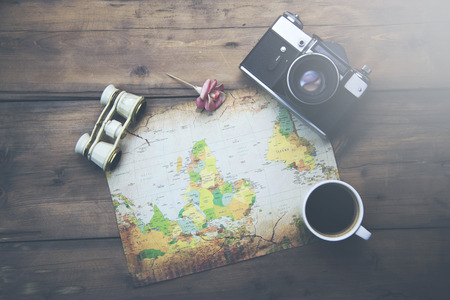 different travel items on map on wooden table