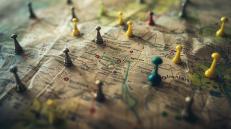 A detailed vintage map featuring metallic push pins that mark locations, adding a unique touch to travel planning and exploration.