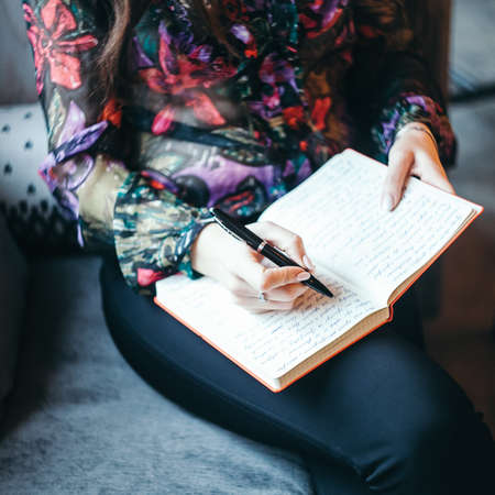 Close-up of a woman's hands holding a notebook and a pen, and making a note. journalism.