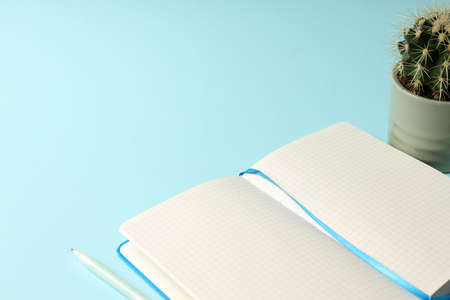 Open empty blank notebook organizer with pen for planning work on laptop