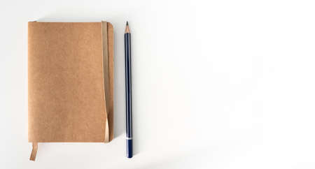 top down view of small brown notebook and sharp pencil on white desk