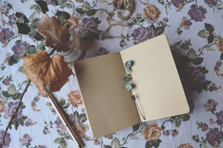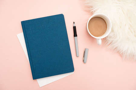 Comfortable and cozy workspace with diary book, coffee mug, decor and copy space on white table. Reading, writing table.