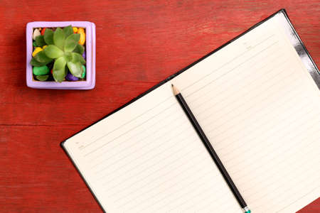 Cactus, notebooks, notepads and pencils on the wooden floor red.