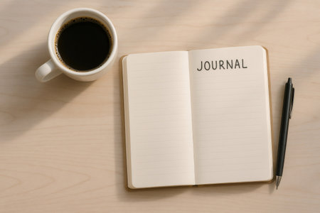 An open notebook with a pen rests on a wooden table, suggesting a setting for writing or planning. The image showcases warm, natural tones and textures. The composition, lit by overhead lighting, presents a top-down view. This image is suitable for various commercial uses, including articles and marketing materials.