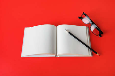 Photo of blank book, pencil and glasses on red paper background. Responsive design mockup. Stationery elements. Template for placing your design.