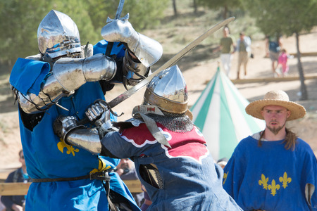 Fighters on the World Championship of Medieval Combat on May 2, 2014 in Belmonte, Cuenca, Spain This championship is celebrating in the Belmonte castle from May 1 to May 4