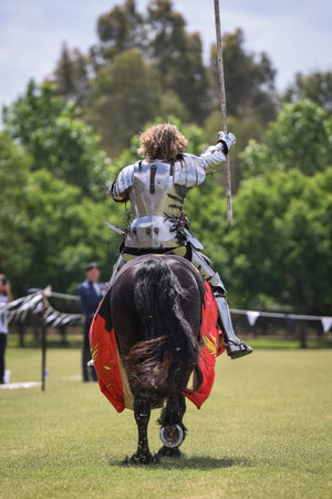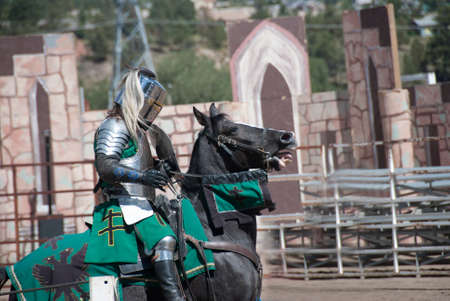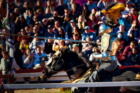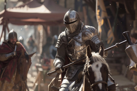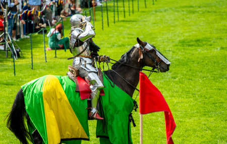 armored medieval knight on horseback at jousting competition