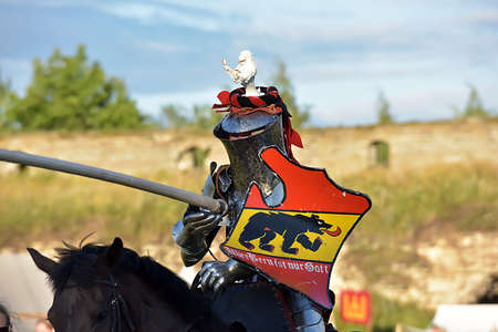 Knight on the horse taking part in tournament reconstruction, St. Petersburg, Russia