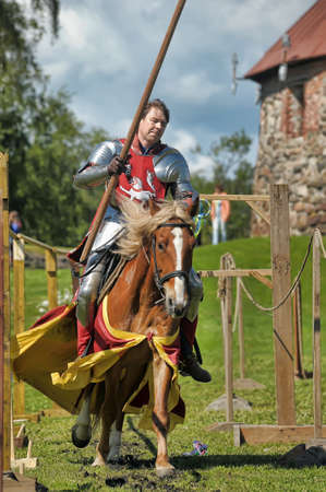 Russia, Priozersk 06.07.2014 A knight with a spear on a horse at the Russian Fortress festival of historical reconstruction