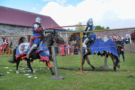 Russia, Ivangorod 01.08.2005 Festival of the medieval reconstruction Russian fortress. Riders on horseback in the tournament