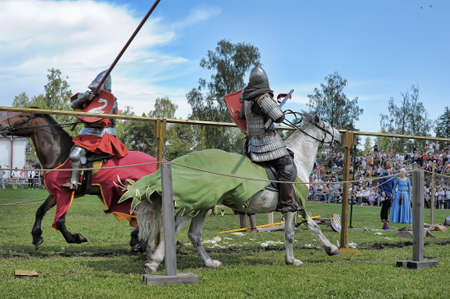 Russia, Priozersk 06.07,2014 Two knights fight on spears at the festival of historical reconstruction Russian Fortress