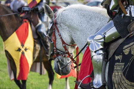 Knight on horseback. Horse in armor with knight holding lance. Horses on the medieval battlefield.