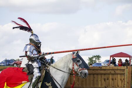 Brackley, UK - June 7th 2019: People dressed as medieval knights on horseback take part in a jousting competition